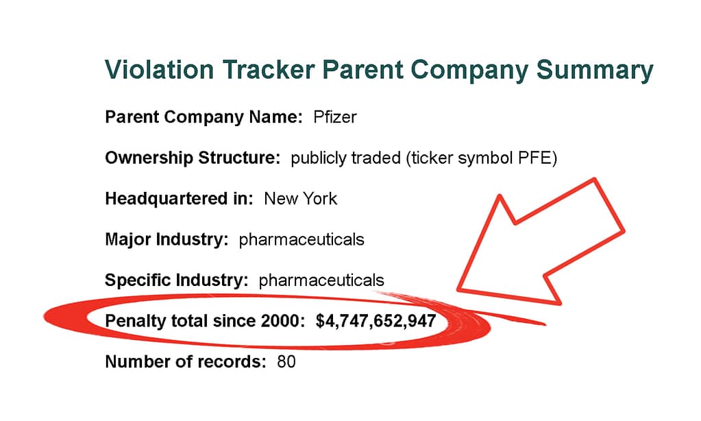 Parent Company Name:  Pfizer Ownership Structure:  publicly traded (ticker symbol PFE) Headquartered in:  New York Major Industry:  pharmaceuticals Specific Industry:  pharmaceuticals Penalty total since 2000:  $4,660,896,333 Number of records:  71