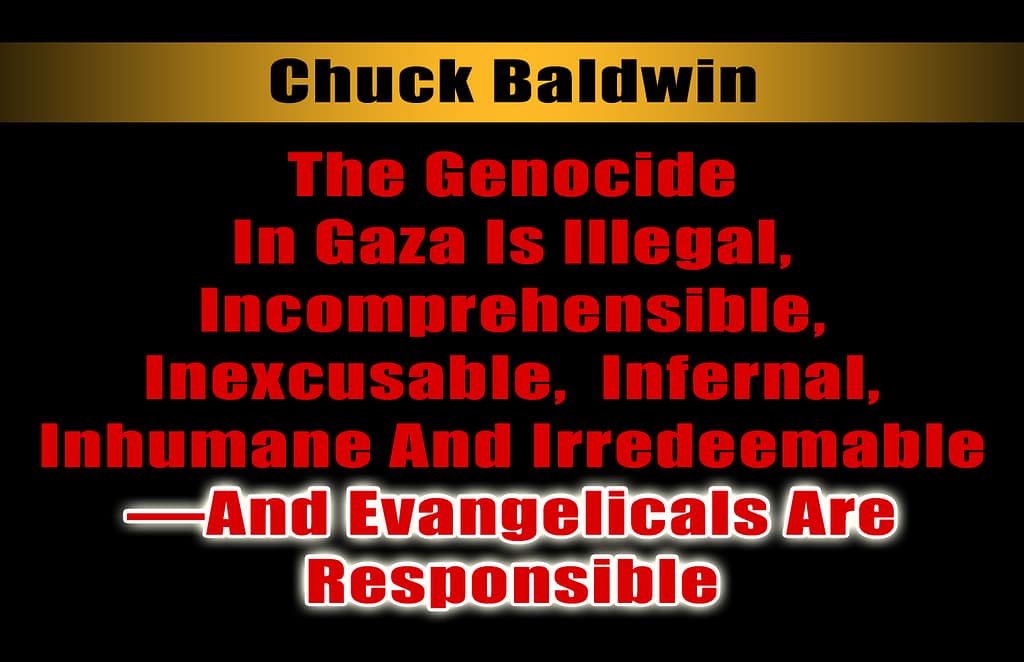 Again, all of this torture, starvation, ethnic cleansing and genocide are the result of the enthusiastic complicity of America’s evangelicals. And all of the enthusiastic complicity of the evangelicals comes from the false prophecy doctrines invented by John Darby and Cyrus Scofield known as Prophetic Dispensationalism, aka Christian Zionism.